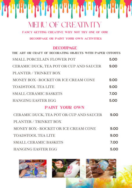 Fancy getting creative? Why not try one of our decoupage or paint your own activities